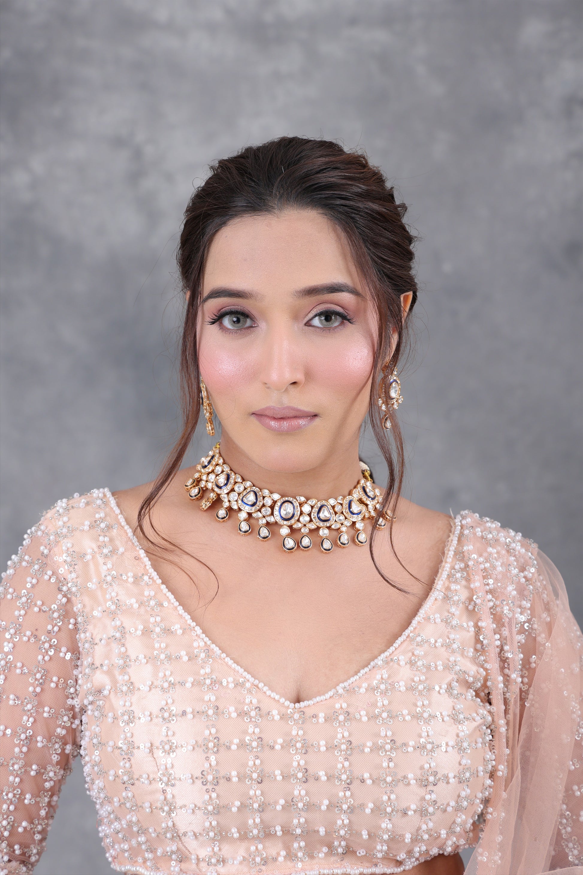 Intricate Meenakari detailing adds depth and sophistication, making this necklace set a true statement of opulence. Richly detailed and extravagantly designed, it is the perfect accessory for making a lasting impression and garnering endless admiration.