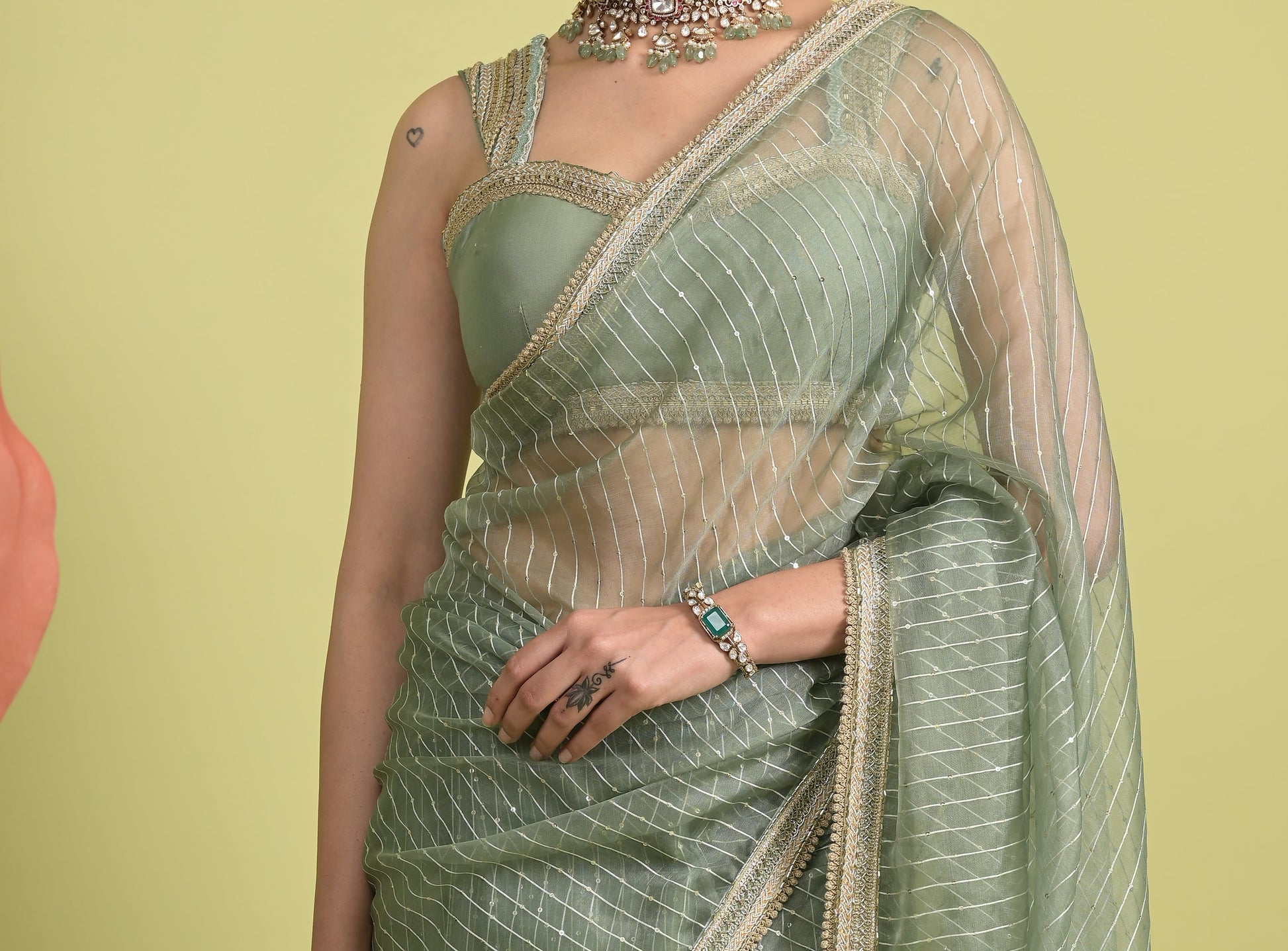 A true showstopper, this polki-studded, gold-polished cuff bracelet exudes regal charm with a hint of edgy sophistication. Encrusted with high-quality polki stones and intricate meenakari detailing, it features striking emerald accents that add a rich pop of color. Perfect for festive occasions or elegant evenings, this handcrafted piece effortlessly blends traditional artistry with modern allure.